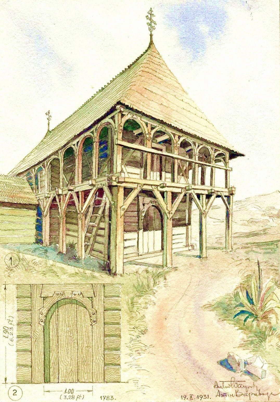 1931 р. Загальний вигляд з позиції А4Розмір зображення: 1076:1545 піксел Рисунок Антона Вариводи (Краків), 19.10.1931 р. 1783 Monastery, Lisnyky (Lesniki), Berezhany. 1 – Northwestern view; 2 – Main entrance door. |