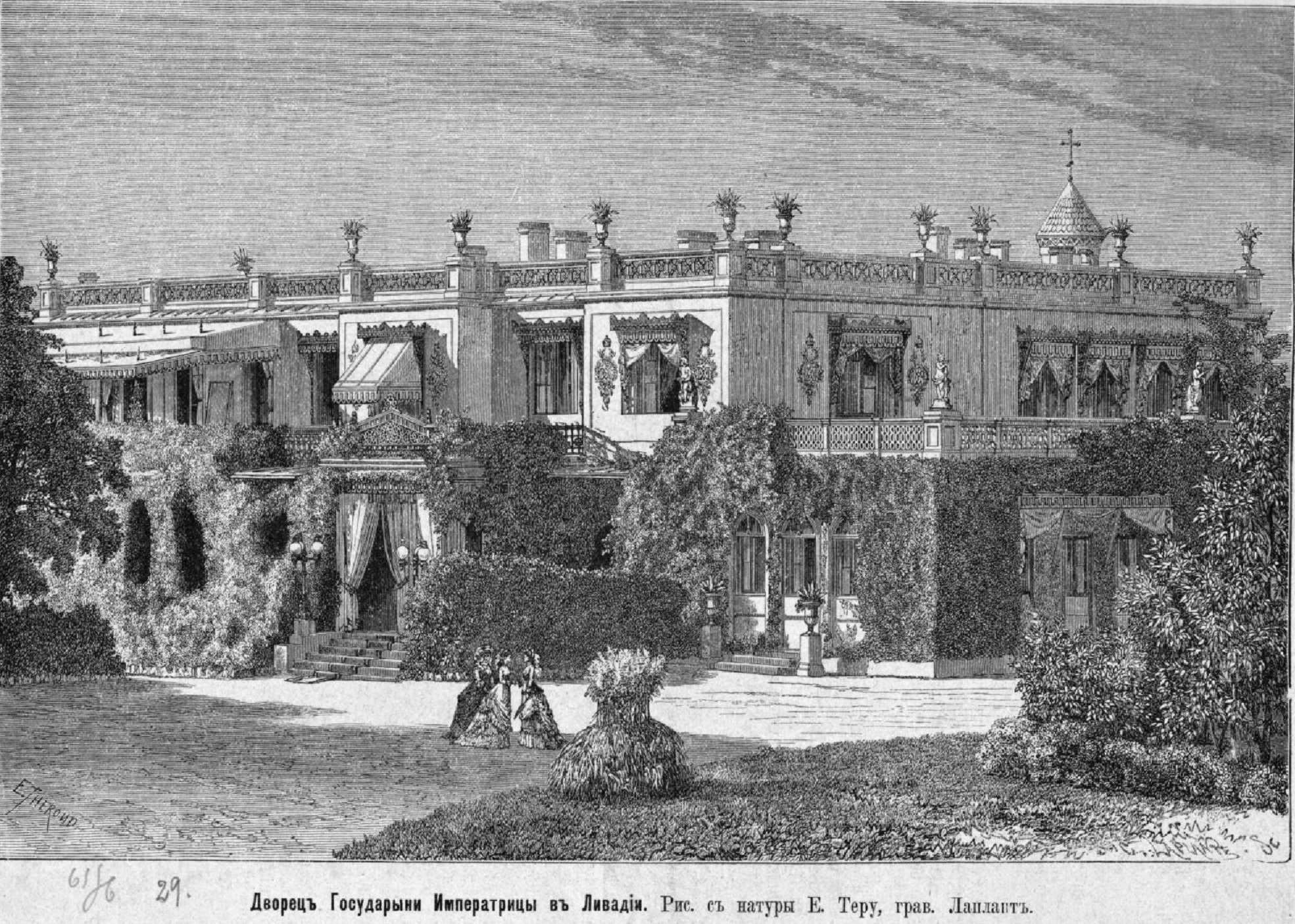 1870-і рр. (?) Палац імператриці МаріїРозмір зображення: 1969:1406 піксел Гравюра Лапланта з рисунка Е. Торе 4 чв. 19 ст. (?) з альбому видів Криму в Державній науковій архітектурно-будівельній бібліотеці (Київ) |