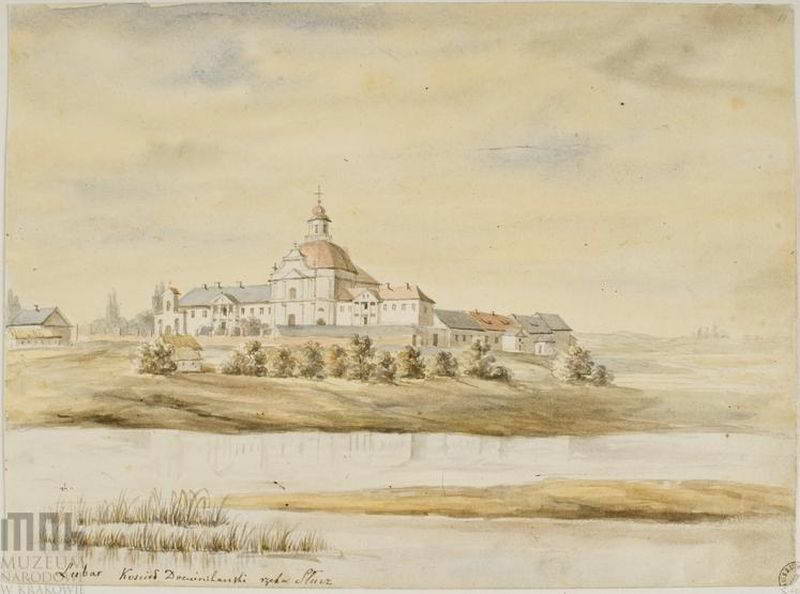 Kościół parafialny podominikański p.w. śś. Michała i Jana Nepomucena i klasztor. Widok od strony rzeki Słucz. Kościół z kopułą nad nawą; po obu stronach budynki klasztorne dwukondygnacjowe z portykami kolumnowymi; w odrodzeniu arkadowa dzwonnica-brama. Napis: Lubar Kościół Dominikański; rzeka Słucz; napis na podkładzie: Lubar. Wołyń. 1862-1876. Rys. ołówkiem podmalowany akwarelą. 20,5 x 27,7 cm. Muzem Narodowe, Kraków. III-r.a. 4186 (Teka Wołyń). [Katalog rysunków architektonicznych ze zbiorów Muzeum narodowego w Krakowie. 1. Rysunki Napoleona Ordy / Opracowały Zofia Kucielska i Zofia Tobiaszowa. – Warszawa: Państwowe wydawnictwo naukowe, 1975, Nr. 390]