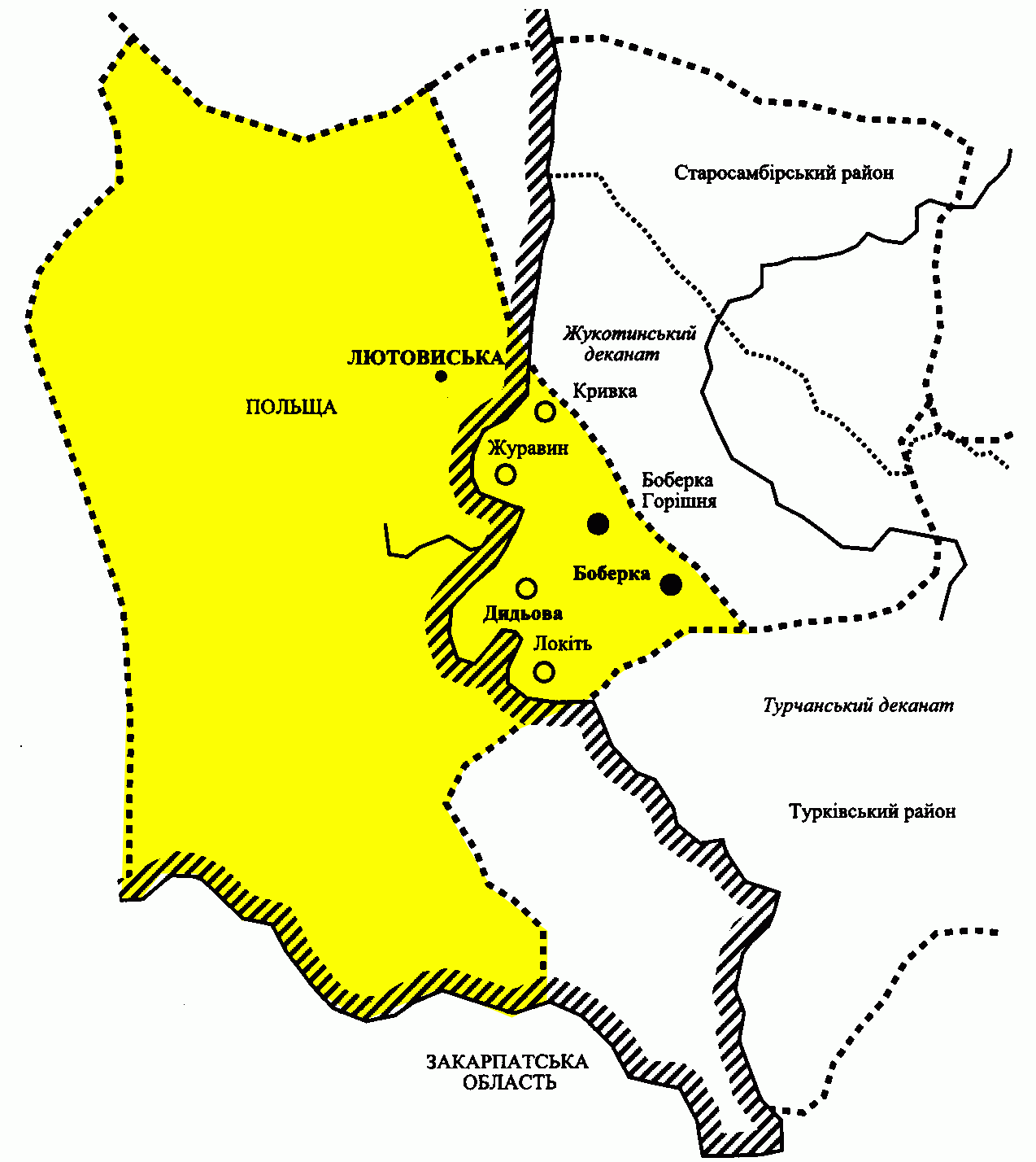Картосхема деканату за В.СлободяномРозмір зображення: 1274:1428 піксел Джерело: Слободян В. Церкви України: Перемиська єпархія. – Льв.: 1998 р., с. 321. |