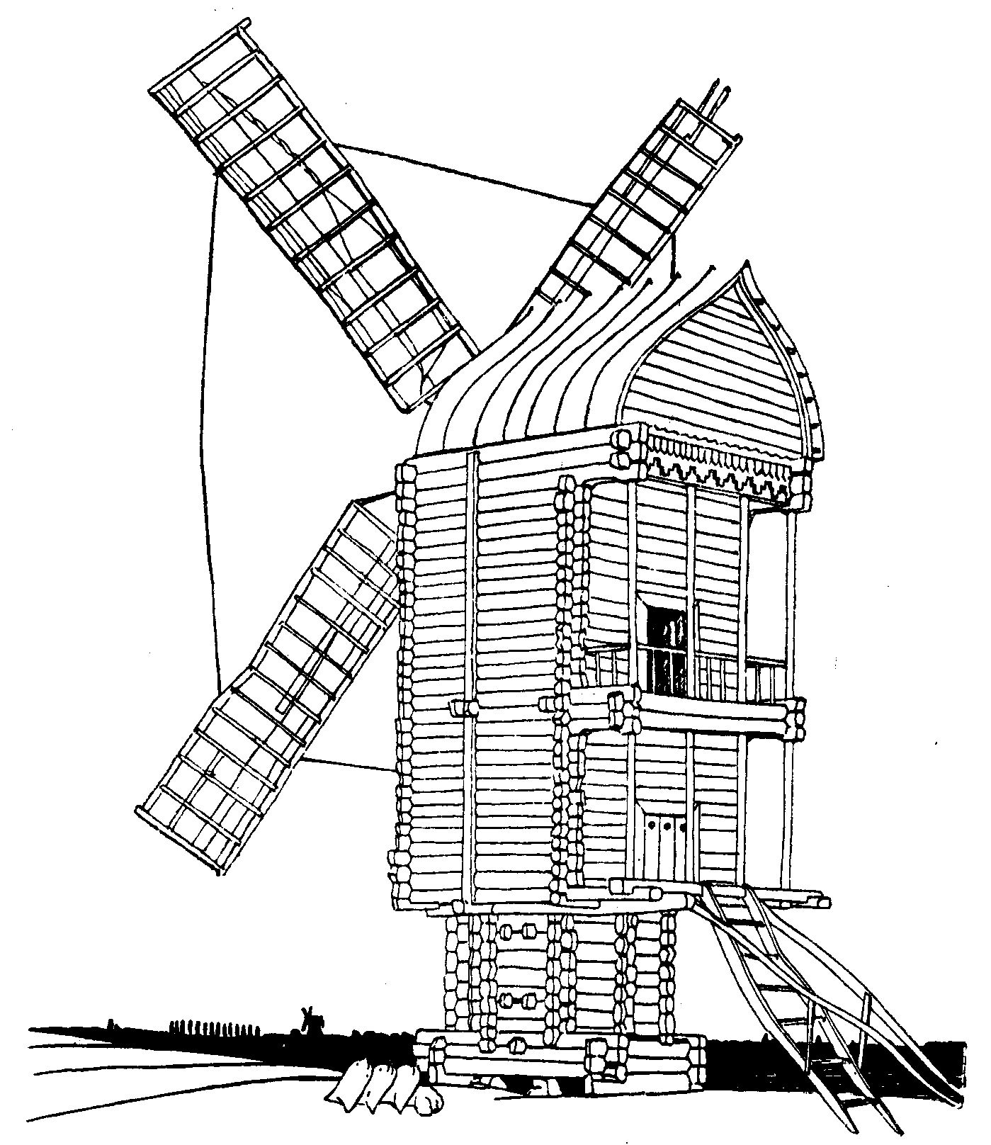 Вітряк, с. Логачівка, Харківщина. За рисунком М. КатерногиРозмір зображення: 1399:1616 піксел Джерело: Юрченко П.Г. Дерев’яне зодчество України. – К.: 1949 р., с. 82. |