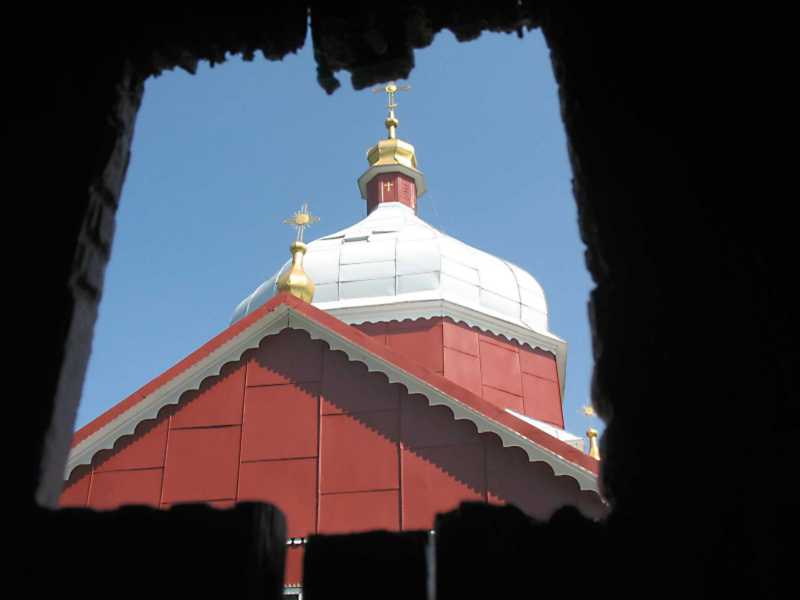 2008 р. Купол церкви крізь отвір дзвонуРозмір зображення: 800:600 піксел Фото Зенона Боровця і Богдана Тхора, 8 серпня 2008 р. |