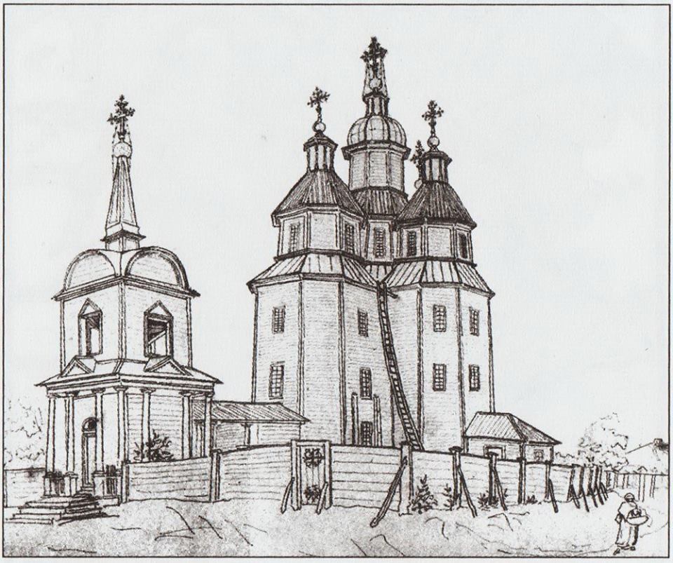 Троїцька церква в Лубнах. Рисунок Карла Мазера 1851 р. Опубліковано в книзі В.В. Вечерського «Пам’ятки архітектури й містобудування Лівобережної України»