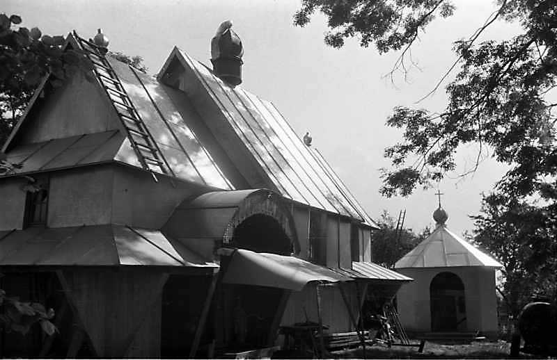 1989 р. Церква і каплиця. Вигляд з позиції А3Розмір зображення: 800:518 піксел 1989 р. 6 липня. Фото М.І.Жарких. Негатека, № 519-30. |