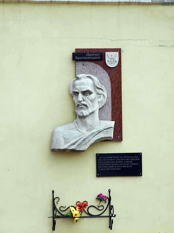 На дошці напис: «Тут, на площі Ринок, 26 листопада 1702 р. після тортур ўув жорстоко страчений наш земляк поет, патріот, захисник українського православія член Луцького Хрестовоздвиженського братства Данило Братковський».