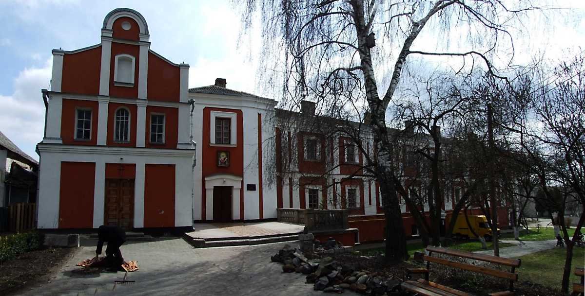 2012 р. Панорама з півночі Розмір зображення: 1200:609 піксел 9 квітня 2012 р. Фото М.І.Жарких. Вкладені елементи Цекрва св.Кирила і Мефодія та фрагмент корпусу келій Корпус келій