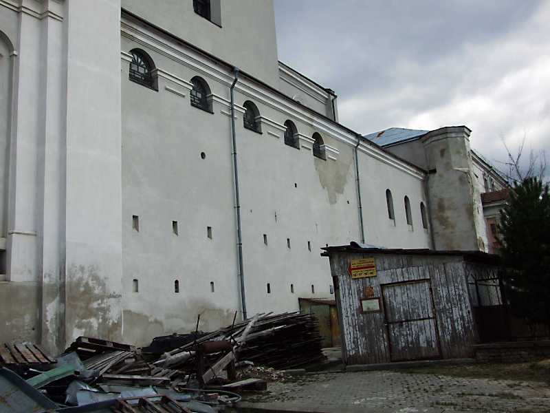 2012 р. Бічний фасад костелуРозмір зображення: 800:600 піксел Вигляд з позиції А3 (з північного заходу). 9 квітня 2012 р. Фото М.І.Жарких. |