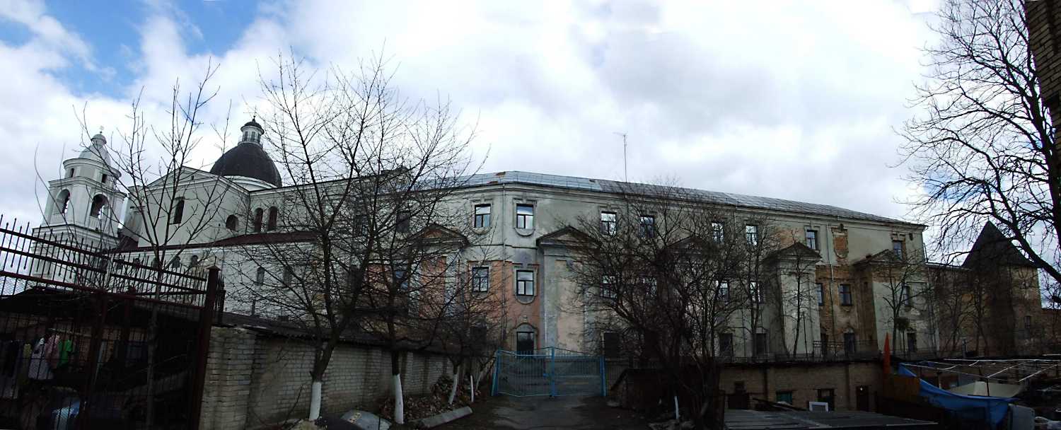 2012 р. Панорама з південного заходу Розмір зображення: 1500:608 піксел 9 квітня 2012 р. Фото М.І.Жарких. Вкладені елементи Костел Корпус келій і башта Чорторийських