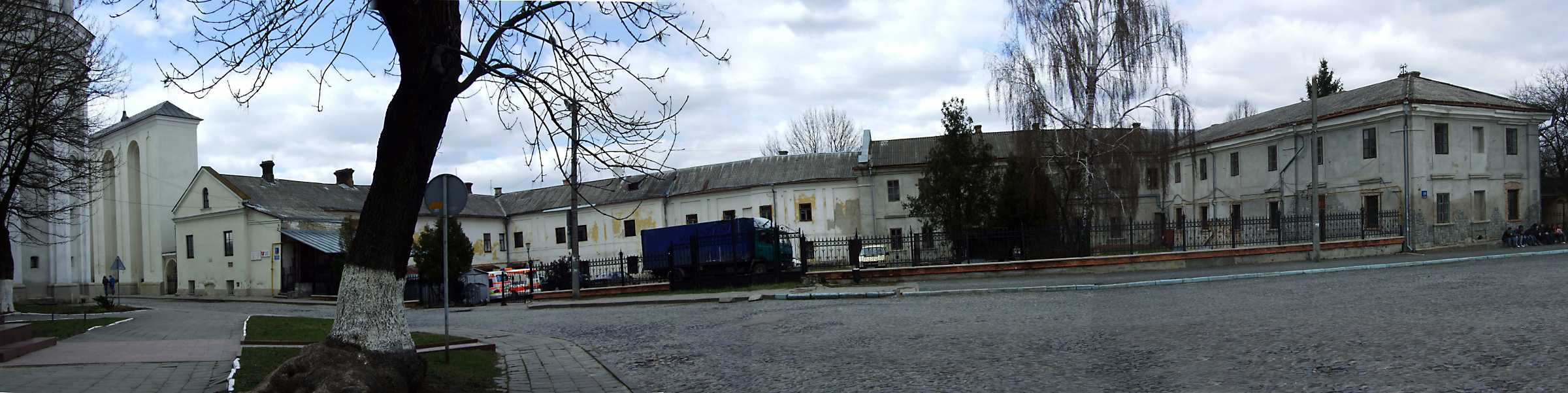 2012 р. Панорама з південного сходу Розмір зображення: 2400:601 піксел 9 квітня 2012 р. Фото М.І.Жарких. Вкладені елементи Дзвіниця і західне крило Західна частина північного корпусу Східна частина північного корпусу Східне крило