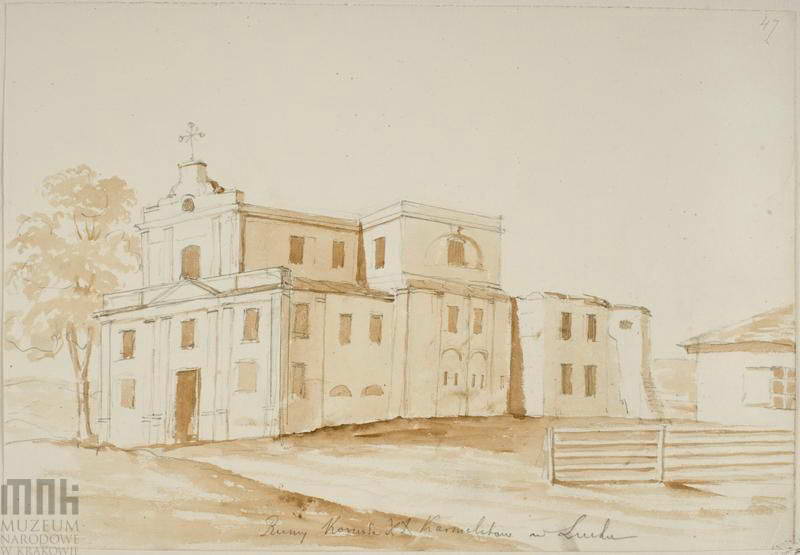 Ruiny kościoła i klasztoru karmelitów. Widok fasady i elewacji bocznej. Kościół trzynawowy z transeptem, fasada dwukondygnacjowa, w górnej części węższa zwieńczona attyką z krzyżem; obok ruiny dwukondygnacjowego budynku klasztornego. 1862 – 1876. Napis: Ruiny Kościoła XX Karmelitów w Łucku; napis na podkładzie: G. Wołyńska Łuck, — ruiny kość. Karmelitów. Rys. ołówkiem podmalowany sepią, 20,2x29,3. III-r.a. 4194 (Teka Wołyń). [Katalog rysunków architektonicznych ze zbiorów Muzeum narodowego w Krakowie. 1. Rysunki Napoleona Ordy / Opracowały Zofia Kucielska i Zofia Tobiaszowa. – Warszawa: Państwowe wydawnictwo naukowe, 1975, Nr. 404]