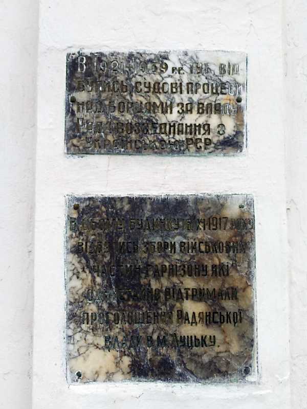 На нижній дошці написано: «В цьому будинку 16 ХІ 1917 року відбулися збори військових частин гарнізону, які одностайно підтримали проголошення Радянської влади в м.Луцьку».