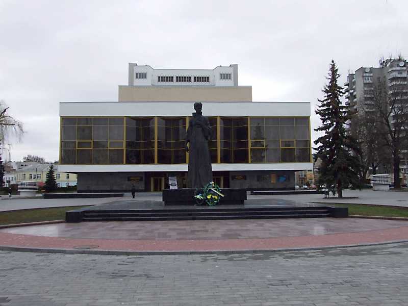 2012 р. Пам’ятник на тлі обласного театру Розмір зображення: 800:600 піксел 9 квітня 2012 р. Фото М.І.Жарких. Вкладені елементи Постать Лесі Українки (+) Постать Лесі Українки (2) (+)