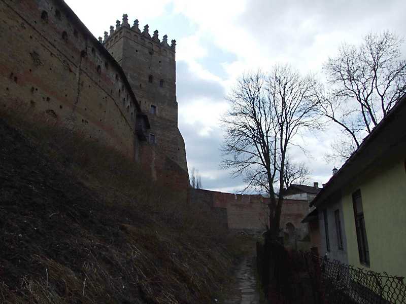 Ліворуч – північний мур; далі – Надбрамна башта. В центрі – відновлений мур Окольного замку. Праворуч – фрагмент будинку по вул.Кафедральній, 27. 9 квітня 2012 р. Фото М.І.Жарких.