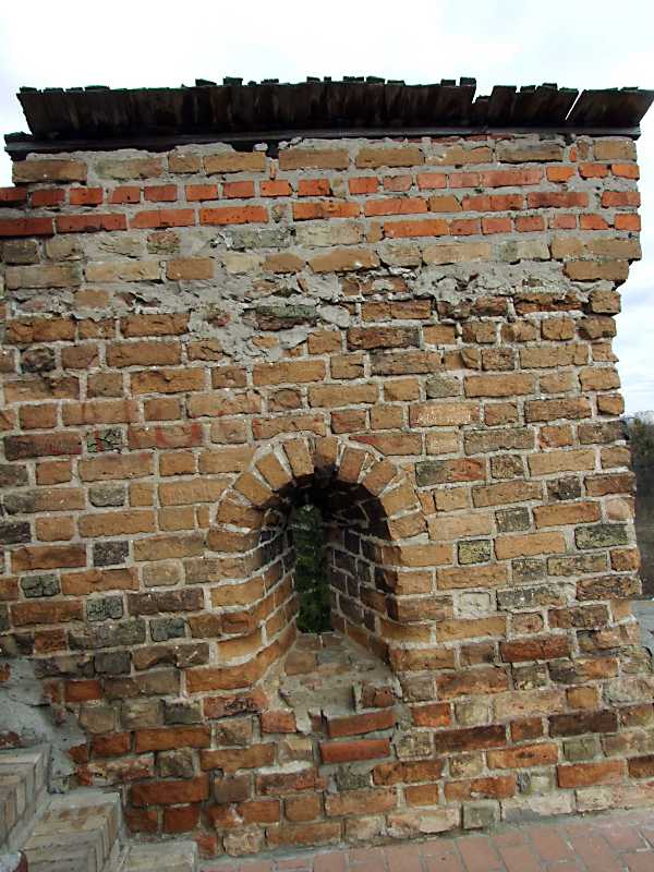 2012 р. Зубець східного муру з бійницеюРозмір зображення: 600:800 піксел Біля Владичної башти. 9 квітня 2012 р. Фото М.І.Жарких. |