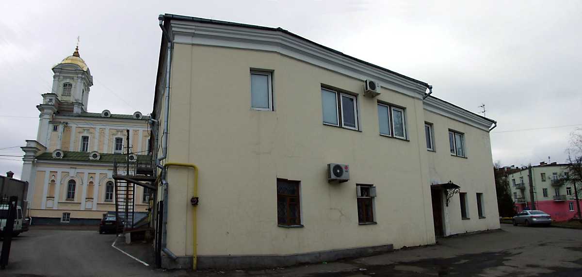 2012 р. Фрагмент костелу і південно-східний флігель. Вигляд з позиції С2Розмір зображення: 1200:571 піксел 9 квітня 2012 р. Фото М.І.Жарких. |
