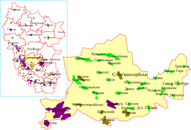 Верховна Рада України постановляє (07.10.2014, № 1692-VII): 1. Змінити межі Новоайдарського і Слов’яносербського районів Луганської області, збільшивши територію Новоайдарського району на 30010,28 гектара земель за рахунок передачі до його складу 1639,00 гектара земель, що знаходяться у віданні Щастинської міської ради Луганської міської ради (в тому числі територію міста Щастя), 10761,90 гектара земель – Кримської сільської ради Слов’яносербського району (в тому числі території села Кримське, села Причепилівка, села Сокільники), 17217,40 гектара земель – Трьохізбенської сільської ради Слов’яносербського району (в тому числі території села Трьохізбенка, села Кряківка, села Оріхове-Донецьке), 320,88 гектара земель – Жовтенської сільської ради Слов’яносербського району (в тому числі територію села Лобачеве), 71,10 гектара земель – Слов’яносербської селищної ради Слов’яносербського району (в тому числі територію села Лопаскине), та затвердити територію Новоайдарського району загальною площею 183588,28 гектара, Слов’яносербського району загальною площею 82965,72 гектара. 2. Встановити межі Новоайдарського району та відповідні межі Слов’яносербського району Луганської області згідно з додатком.