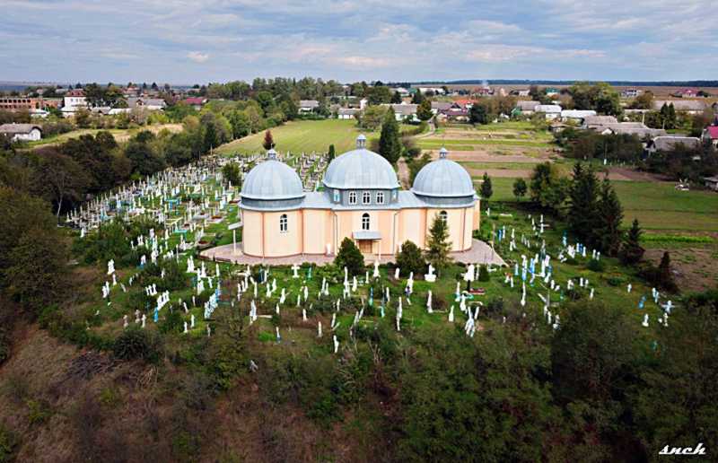 Церква: орієнтація вівтаря 90°, на цвинтарі, на околиці села над Дністром; дзвіниця в позиції А1; головний вхід – А3. Cпостереження М.І.Жарких, 16 серпня 1991 р., 22.06.1992 р.