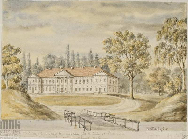 Pałac Miączyńskich. Wjdok od strony podjazdu. Pałac dwukondygnacjowy z portykiem kolumnowym w wielkim porządku i dwoma ryzalitami. 1862 – 1876. Dat.: Maciejów 24 Pazd. Napis: Maciejów Atanazy Hr. Miączyński towarzysz wyprawy i bitwy pod Wiedniem — za odz… czenie się… [uszkodzenie]; napis na podkładzie: Wołyń. Maciejów,—pałac. Rys. ołówkiem podmalowany akwarelą, 21x28,6. Ill-r.a. 4196 (Teka Wołyń) [Katalog rysunków architektonicznych ze zbiorów Muzeum narodowego w Krakowie. 1. Rysunki Napoleona Ordy / Opracowały Zofia Kucielska i Zofia Tobiaszowa. – Warszawa: Państwowe wydawnictwo naukowe, 1975, Nr. 410]