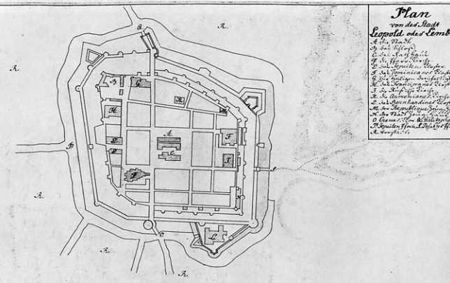 План Львова періоду польсько/шведських воєн, орієнтовно 1702..1704 рр. [Шишка О. В. Картографування Львова: 1582 – 1770 рр. – Вісник геодезії та картографії, 2011 р., № 4, с. 45]