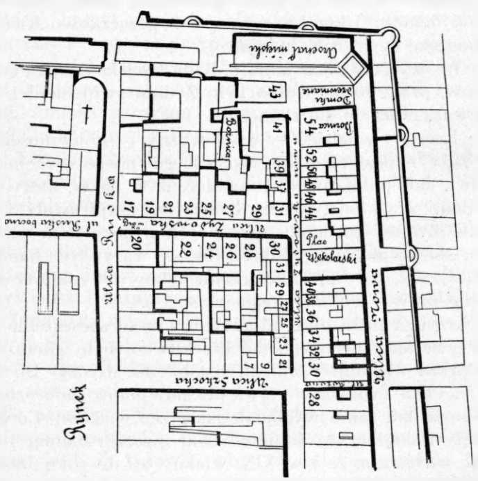 2 пол. 18 ст. План єврейської дільниці середмістяРозмір зображення: 688:692 піксел [Bałaban M. Dzielnica żydowska, jej dzieje i zabytki. – Lw.: 1909, s. 12.] Номери будинків відповідають поч. 20 ст., вони більш-менш збігаються із сучасними. |