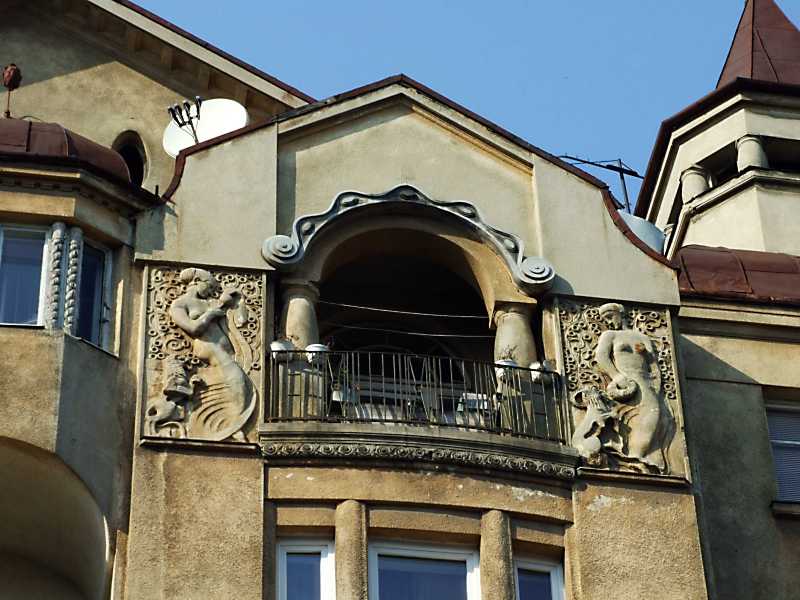 Правий сецесійний фронтон Розмір зображення: 800:600 піксел 19 квітня 2013 р. Фото М.І.Жарких. Вкладені елементи Ліва скульптурна композиція Права скульптурна композиція