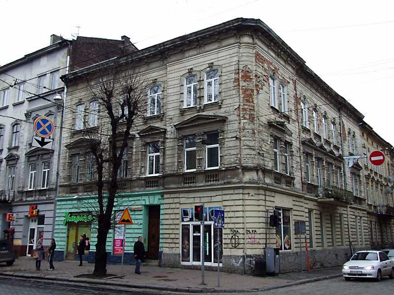 Житловий будинок (№ 25)Розмір зображення: 800:600 піксел У № 25 у 1950-1960 роках містилося кафе та пошиття й ремонт головних уборів. Ілько Лемко Джерело: “”, 1 серпня, 2008 року, № 110 (418) |