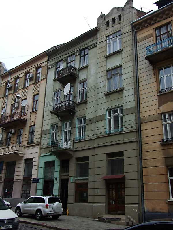 Житловий будинок (№ 4)Розмір зображення: 600:800 піксел Житловий будинок у стилі сецесії спроектовано архітекторами Владиславом Дердацьким та Вітольдом Мінкевичем у 1909 році; побудований фірмою Івана Левинського. |