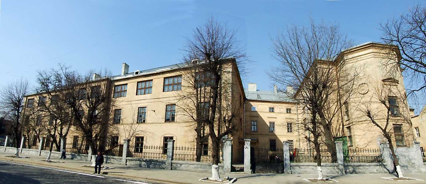 2013 р. Панорама з південного заходу Розмір зображення: 1388:600 піксел 19 квітня 2013 р. Фото М.І.Жарких. Вкладені елементи Лівий корпус Костел