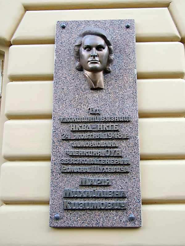 На дошці напис: «Тут, у колишній в’язниці НКВД-НКГБ 24 жовтня 1948 р. замордована членкиня ОУН, зв’язкова генерала Романа Шухевича Марія Михайлівна Кизимович».