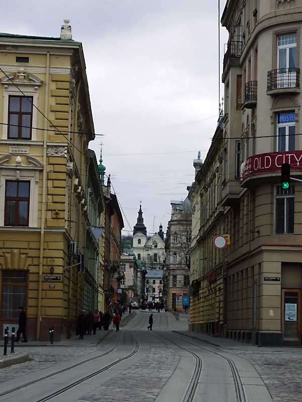 2012 р. Перспектива від просп. СвободиРозмір зображення: 600:800 піксел 8 квітня 2012 р. Фото М.І.Жарких. Перспектива вулиці П. Беринди, південного боку пл. Ринок та вул. Руської з видом на костел кармелітів (вул. Винниченка, 22). |