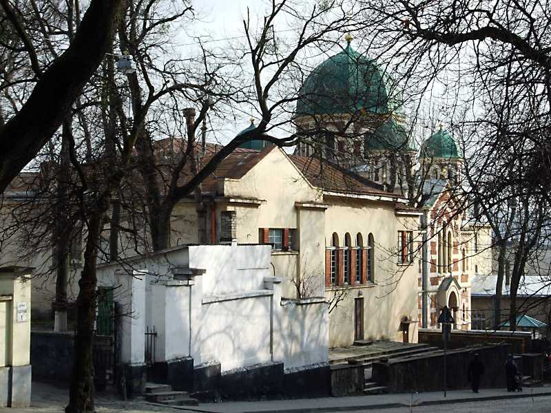 Російський культурний центр (1а), за ним церква св. Георгія. 7 квітня 2012 р. Фото М.І.Жарких.