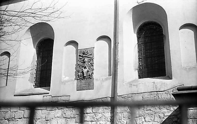 Фрагмент бічного фасаду з плитою МогилРозмір зображення: 800:503 піксел 1976 р. 24 квітня. Фото М.І.Жарких. Негатека, № A114-22. |