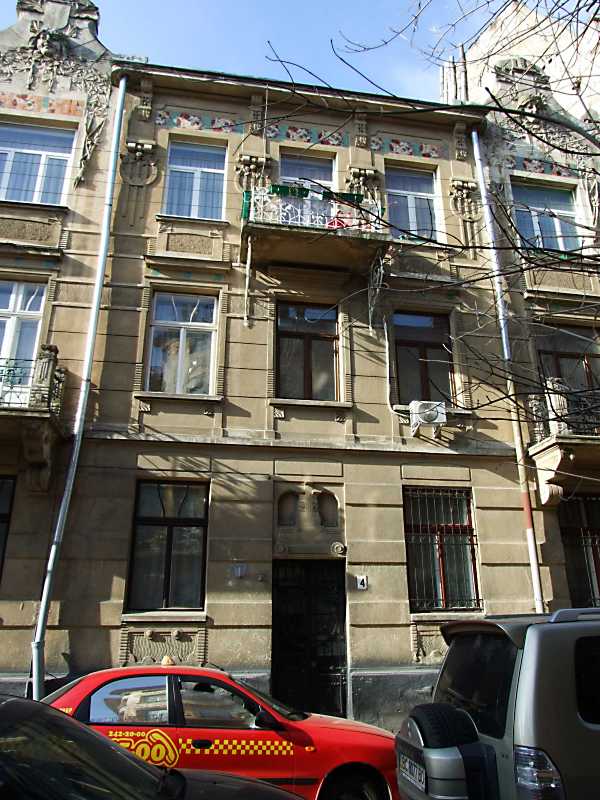 2013 р. Головний фасад Розмір зображення: 600:800 піксел 16 квітня 2013 р. Фото М.І.Жарких. Вкладені елементи Лівий сецесійний фронтон (+) Сецесійний майоліковий фриз Правий сецесійний фронтон (+) Сецесійний вхід