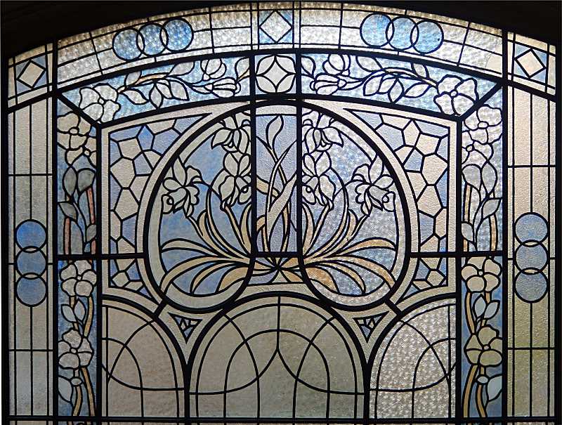 Верхнє полотнище вітража Розмір зображення: 800:605 піксел Фото Ольги Соляр, 16 жовтня 2017 р. Вкладені елементи Фрагмент верхнього полотнища