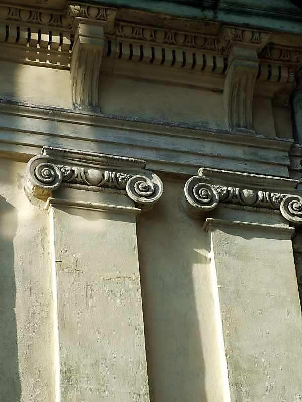 Іонічні капітелі пілястр (фасад по вул.Братів Рогатинців)Розмір зображення: 600:800 піксел 14 вересня 2007 р. Фото М.І.Жарких. |