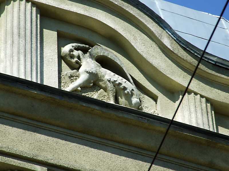 Сецесійний грифон на фронтоні (правий) Розмір зображення: 800:600 піксел 19 квітня 2013 р. Фото М.І.Жарких. Попередня сторінка | Вище | Наступна сторінка