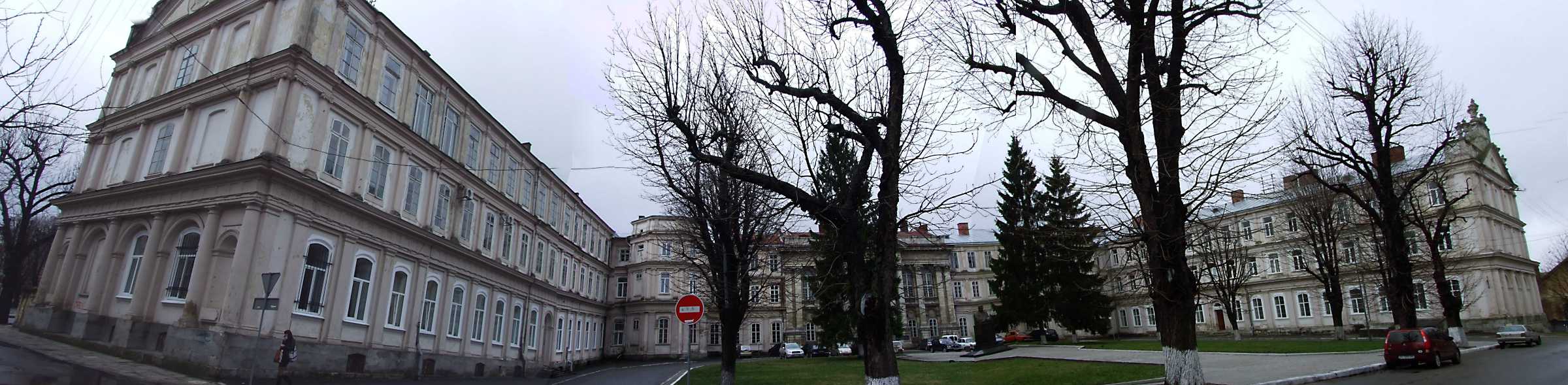 2012 р. Панорама з півночі Розмір зображення: 2400:589 піксел 7 квітня 2012 р. Фото М.І.Жарких. Вкладені елементи Східне крило Центральна частина (+) Баштоподібний об’єм Західне крило
