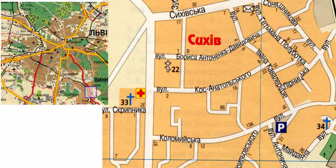 Ситуаційний план (церква позначена білим хрестом – 22)Розмір зображення: 1100:550 піксел Джерело: Карта м.Львова. – К.: 2001 р., 1:20 000. |