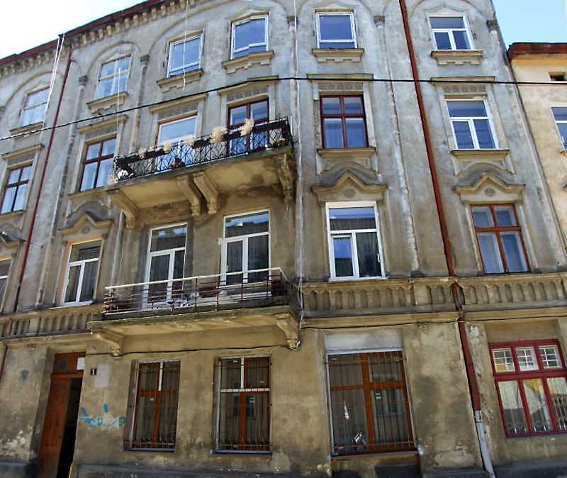 Житловий будинок (№ 1) Розмір зображення: 800:674 піксел 18 квітня 2013 р. Фото М.І.Жарких. Вкладені елементи 2013 р. Ліва частина головного фасаду 2013 р. Права частина головного фасаду