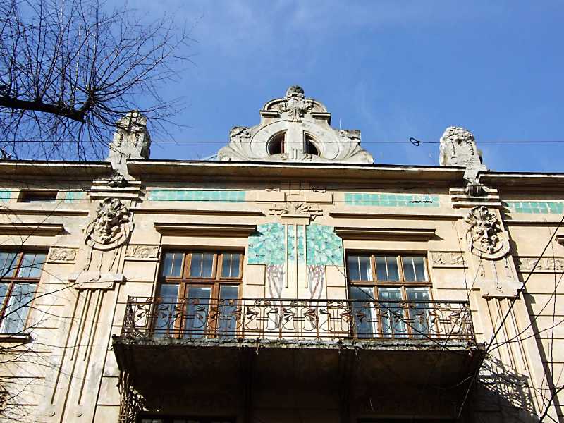 2013 р. Сецесійний балкон 2-го ярусу і фронтонРозмір зображення: 800:600 піксел 16 квітня 2013 р. Фото М.І.Жарких. |