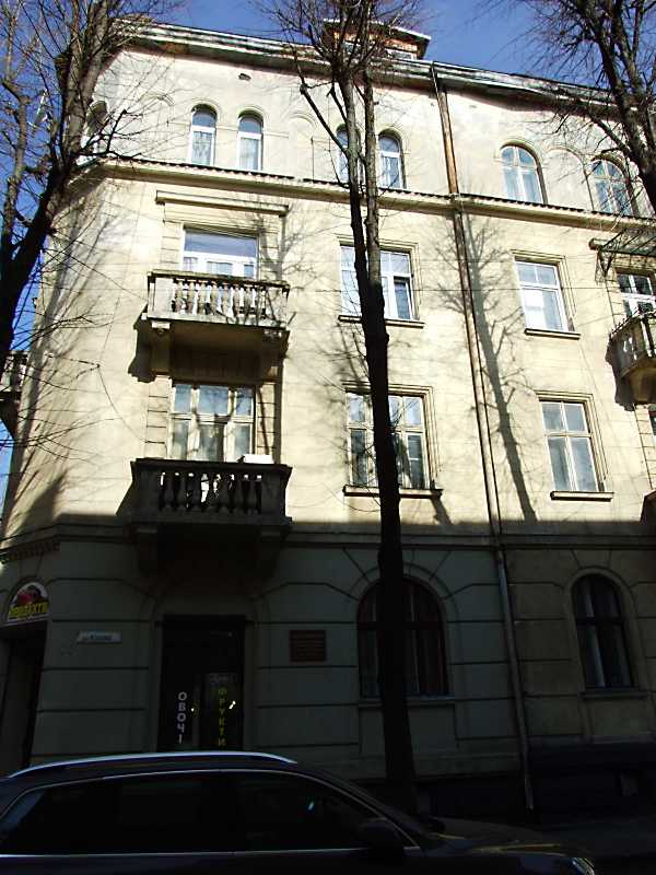 2013 р. Фрагмент фасаду по вул. Павлика Розмір зображення: 600:800 піксел 16 квітня 2013 р. Фото М.І.Жарких. Вкладені елементи Меморіальна ошка І. Крип’якевичу