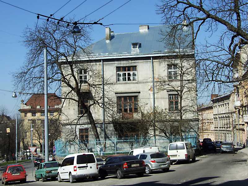 2013 р. Торцевий фасадРозмір зображення: 800:600 піксел Ліворуч – площа Данила Галицького, праворуч – вулиця Насипна. 18 квітня 2013 р. Фото М.І.Жарких. |