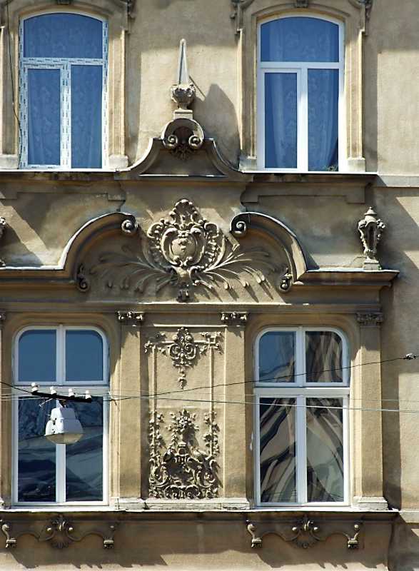 2013 р. Вікна 2-го поверху з фронтоном Розмір зображення: 587:800 піксел 19 квітня 2013 р. Фото М.І.Жарких. Вкладені елементи Рельєфний фронтон