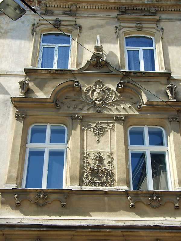 2013 р. Центральна частина головного фасаду Розмір зображення: 600:800 піксел 19 квітня 2013 р. Фото М.І.Жарких. Вкладені елементи Рельєфний картуш Рельєфна вставка