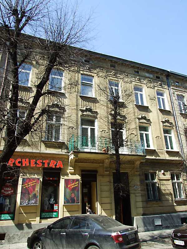 Житловий будинок (№ 10) Розмір зображення: 600:800 піксел 19 квітня 2013 р. Фото М.І.Жарких. Вкладені елементи Сецесійне вікно 3-го поверху (+) 2013 р. Сецесійне вікно 2-го поверху (+)