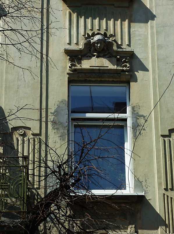 2013 р. Сецесійне вікно 2-го поверху Розмір зображення: 598:800 піксел 19 квітня 2013 р. Фото М.І.Жарких. Вкладені елементи Фронтон вікна 2-го поверху