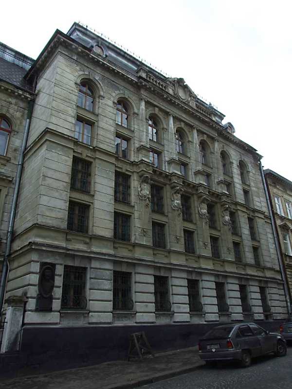 2012 р. Центральна частина головного фасаду Розмір зображення: 600:800 піксел 4 квітня 2012 р. Фото М.І.Жарких. Вкладені елементи Консоль (півпостать юнака) Консоль (півпостать дівчини) Меморіальна дошка І. Франку