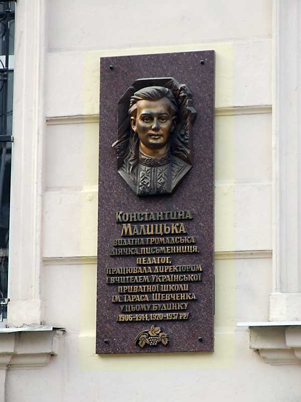 На дошці напис: «Константина Малицька, видатна громадська діячка, письменниця, педагог, працювала директором і вчителем Української приватної школи ім. Тараса Шевченка у цьому будинку (1906 – 1914, 1920 – 1937 рр.)».