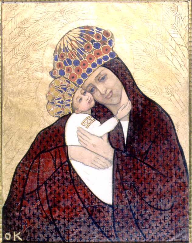 Кульчицька О. Богородиця – “Золотий колос”Розмір зображення: 632:800 піксел О. Кульчицька. Богородиця – “Золотий колос” (близько 1909-1910). Джерело: Бірюльов Ю. Мистецтво львівської сецесії. – Льв.: Центр Європи, 2005 р., с. 114. |