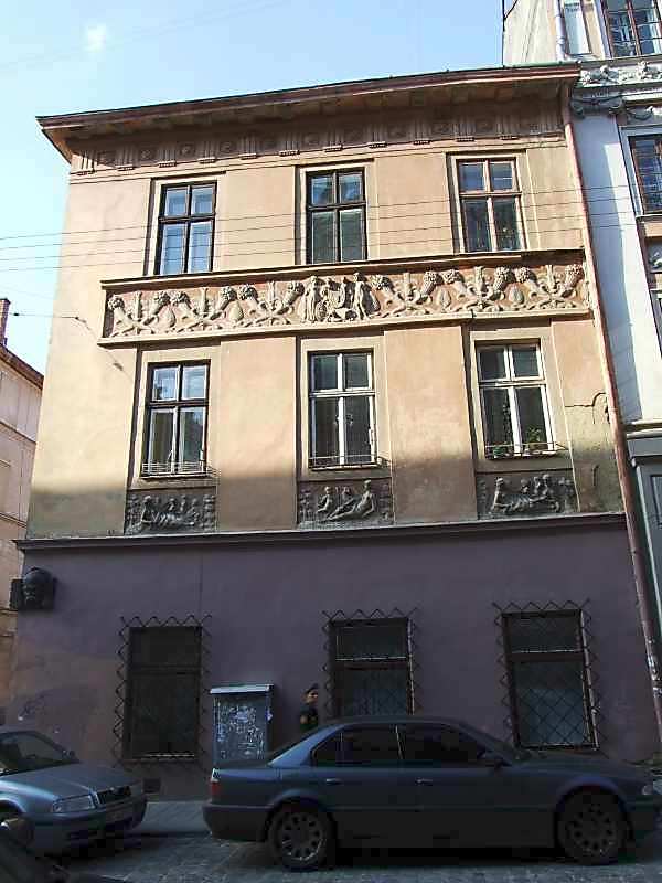 2007 р. Фасад по вул.Вірменській Розмір зображення: 600:800 піксел 14 вересня 2007 р. Фото М.І.Жарких. Вкладені елементи Центральна частина рельєфного фриза (+) Бічна частина рельєфного фриза Рельєфна плита 2-го поверху Рельєфна плита 2-го поверху Рельєфна плита 2-го поверху